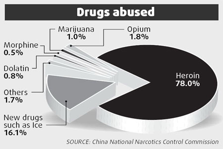 Updated: 2008-06-26 07:01 Traditional drugs such as heroin are posing less of a threat to China, due to a sharp drop in poppy cultivation from the Golden Triangle region and stricter border control, a senior police officer said on Wednesday. "The amount of drugs entering China from the Golden Triangle region has fallen in recent years," Yang Fengrui, director of the anti-drug bureau of the Ministry of Public Security, told a news briefing organized by the State Council Information Office. Yang said a major reason for the decline is the drop in opium cultivation in the Golden Triangle, the infamous drug-producing region that overlaps the mountains of Myanmar, Laos, Vietnam and Thailand. ![]() He said opium cultivation in Myanmar has dropped from 165,300 hectares at a peak of several years ago to a record-low of 18,600 hectares. In Laos, opium cultivation has been almost eliminated. Intensified police checks at borders and the use of advanced drug detectors are also behind the drop, Yang said. Consequently, less drugs are being seized in China. Figures released yesterday showed that Chinese police seized 4.6 tons of heroin last year, down about 20 percent year-on-year. The amount of opium seized also dropped from 1.7 tons in 2006 to last year's 1.2 tons. The change has caused a tight supply of heroin and opium in the illicit drug market, pushing up prices. The average daily cost of heroin for drug abusers in China has increased from 218 yuan ($32) in 2004 to the current 320 yuan, ministry figures showed, while the purity of heroin sold in small packages has fallen sharply. The annual growth rate of heroin users in the country has also dropped from a peak of 30 percent years ago to the current 5.6 percent. Similarly, the proportion of AIDS/HIV infections spread by intravenous drug use has decreased from 68.7 percent in 2001 to 38.5 percent currently, ministry figures showed. Still, Yang said the battle is far from over, with drugs from abroad entering China in large volumes while domestic production grows. He said China will continue to cooperate with Myanmar and other countries by exchanging intelligence, fighting drug traffickers, eradicating drugs, training personnel and helping the Myanmar government with crop substitution programs. Over the past few years, China has invested about 700 million yuan on the substitution programs in Myanmar and Laos, offering 100,000 tons of food and medical aid to people who have stopped farming opium in the regions. As part of the battle against the drugs, Shenzhen police publicly burnt more than 2,759 kg of drugs on Tuesday. In a recent case, local customs in Shenzhen revealed a major drug smuggling case involving the seizure of 113.7 kg of ketamine. Stocks of marijuana, Ice and cocaine, as well as 3 million yuan in cash, were seized in the crackdown launched by local authorities in late April, the Guangzhou Daily reported. |