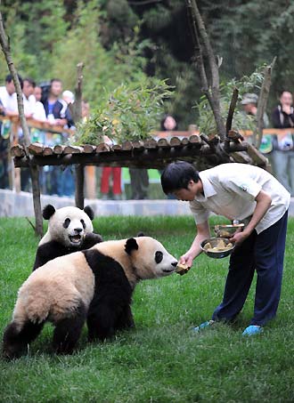 Updated: 2008-06-27 00:51 ![]() A man feeds a panda at the Yunnan Zoo in Kunming, capital of Southwest China's Yunnan Province, June 26, 2008. Three pandas were transferred to their Kunming after the nature reserve in Wolong were severely damaged in last month's magnitude-8.0 temblor. [Xinhua].