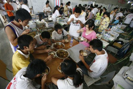 Middle school students eat lunch during a break from their college entrance examination review classes at a temporary classroom in the earthquake-hit Anxian county, Sichuan province June 28, 2008.[Agencies]