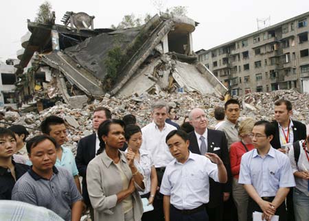 US Secretary of State Condoleezza Rice (front 2nd L) is briefed by a local official as she looks at destroyed buildings during her visit to quake-hit Dujiangyan, Sichuan province June 29, 2008. [Agencies]