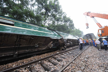The reopening of the blocked railway was delayed as heavy rain hampered the 1,000-people rescue operation, said Shao Liping, head of the railway administration of Nanning. "We have planned to first remove the derailed carriages with crane and clear the mud and rocks, and then have the deformed rail replaced, but we're afraid that the rain may cause new landslides, " said Shao. Four of the injured had been discharged from hospital as of 7 p.m. on Monday and the other three were being treated. "The train was carrying 1,118 passengers. The other passengers have all taken other trains to the southwestern municipality of Chongqing except for the three still in hospital," said the official. The 317-kilometer line links Guangxi with Guangdong Province. |