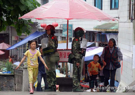 Armed police stand guard on a street in Weng'an, Guizhou Province, July 2, 2008. [Asianewsphoto] Click for More Photos