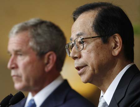 "There is no need to involve politics. Even if China has various problems, they are in the midst of making efforts to improve them, " he added. Bush also reiterated at the press conference that he would be present at the Beijing Olympics opening ceremony. "I view the Olympics as an opportunity for me to cheer on the athletes," he said. "Not going to the opening ceremony for the games would be an affront to the Chinese people," he said. Fukuda and Bush are here to attend the three-day Group of Eight (G8) summit that will begin Monday. Before the press conference, the two leaders held bilateral talks that touched on a wide range of issues. When asked whether the US will take action to strengthen the dollar, Bush said the American economy was not growing as robustly as he would like and that his administration supported a strong US dollar policy. "In terms of the dollar, the United States believes in a strong dollar policy and believes the strength of our economy will be reflected in the dollar. On the nuclear issue of Korean peninsular, Bush said that it is a positive step for DPRK to destroy the cooling tower of its nuclear reactor, and that the country should do more to end its nuclear program. He said that the United States will make sure that the issue of the alleged Pyongyang's abductions of Japanese citizens in the 1970s and 1980s will not be ignored, noting that the US will not abandon Japan on the issue. The two leaders also pledged to enhance cooperation on the issue of climate change. Fukuda said that the G8 members have not reached consensus on the issue, but their views are converging. Bush said that the US will play a "constructive" role in curbing carbon emissions blamed for climate change. |