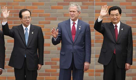 Updated: 2008-07-09 14:41 ![]() US President George W. Bush (C) stands in between Japan's Prime Minister Yasuo Fukuda (L) and Chinese President Hu Jintao during a photo opportunity at the G8 Summit in Toyako, on Japan's northern island of Hokkaido July 9, 2008. [Agencies]