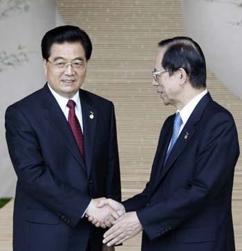 Updated: 2008-07-09 14:41 ![]() China's President Hu Jintao (L) is greeted by Japan's Prime Minister Yasuo Fukuda at the Group of Eight (G8) Hokkaido Toyako Summit in Toyako, on Japan's northern island of Hokkaido July 9, 2008. [Agencies]