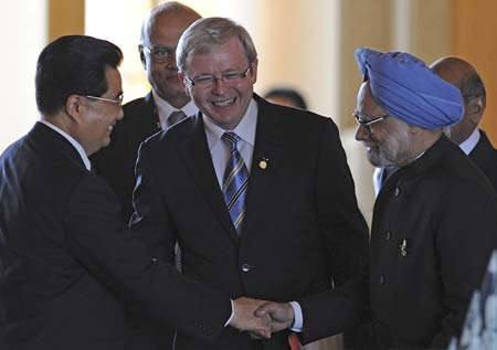 Updated: 2008-07-09 14:41 ![]() Chinese President Hu Jintao (L) shakes hands with Indian Prime Minister Manmohan Singh (R) while Australian Prime Minister Kevin Rudd (C) looks on at the Group of Eight (G8) Hokkaido Toyako Summit in northern Japan July 9, 2008. [Agencies]