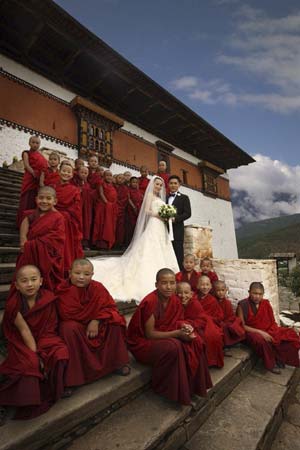 Hong Kong actors Tony Leung and Carina Lau pose with young Bhutanians during their wedding ceremony in the Kingdom of Bhutan July 21, 2008. [Agencies]