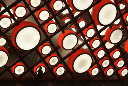 Updated: 2008-07-24 08:51 ![]() A security guard patrols along replicas of Chinese traditional drums which are lit by lights at night at the Olympic Green in Beijing July 23, 2008. [Agencies]