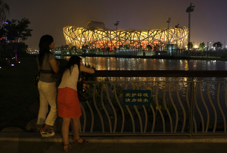 Updated: 2008-07-24 08:51 ![]() Women look at the National Olympic Stadium, also known as the Bird's Nest, which is lit by coloured lights at the Olympic Green in Beijing July 23, 2008. The sign reads, "Love the environment. Please do not play with the water".[Agencies]