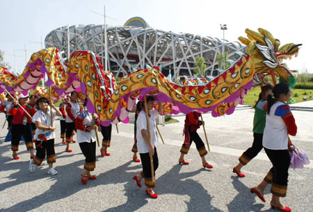 Updated: 2008-08-02 20:50 Performers participating in the dragon dance enter the National Stadium, also known as the Bird's Nest, ahead of a rehearsal for the opening ceremony of the Beijing 2008 Olympic Games August 2, 2008. [Agencies] |