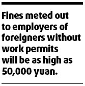 Updated: 2008-08-05 07:38 GUANGZHOU: Firms that employ foreigners without work permits could face fines of up to 50,000 yuan ($7,300), the provincial public security bureau said August 4, 2008. Many companies in Guangdong province seek to employ people from Africa, the Middle East, Vietnam and Myanmar because of low wages.