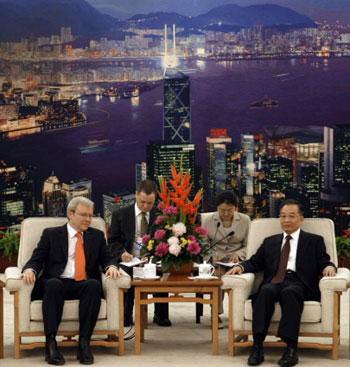 Chinese Premier Wen Jiabao (R) talks with his Australian counterpart Kevin Rudd at the Great Hall of the People in Beijing on August 8, 2008. Rudd is one of many world leaders arriving in the Chinese capital Beijing to attend the opening ceremony of the 2008 Olympic Games. [Agenceis] |