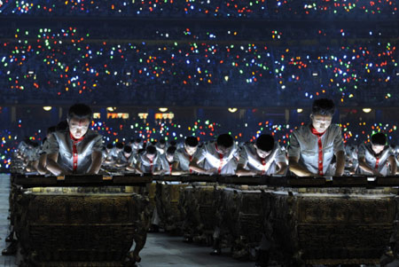 Percussionists hit their Fou drums at the start of the opening ceremony of the 2008 Beijing Olympic Games in Beijing on August 8, 2008. [Agencies]