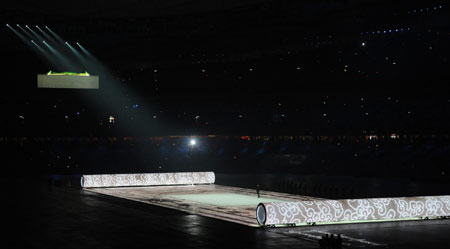 The visual theme of the ceremony is laid down when a pair of scrolls, measuring 2m in diameter and 22m in height, are elevated out of the central rectangle stage. The scrolls part to reveal a traditional Chinese ink painting. Throughout the evening, both the scrolls and the painting, actually an LED display, constantly change their images.