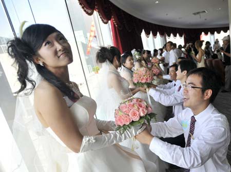Updated: 2008-08-09 22:49 BEIJING - Here's one Olympics competition where China definitely set a record: at least 314,224 couples tied the knot across the nation on Friday, or 08/08/08, the opening day of the 29th Olympic Games, official statistics showed. As expected, that was a one-day record for marriages since 1949, when the People's Republic of China was founded, the Ministry of Civil Affairs said on Saturday.