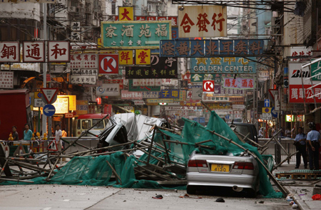 Updated: 2008-08-22 22:24 Destroyed vehicles are seen after the scaffolding of a building still under construction collapsed due to typhoon Nuri, in which two people were injured, at a residential district in Hong Kong, South China, August 22, 2008. Hong Kong was buffeted by gale force winds on Friday as typhoon Nuri churned toward the major financial hub, with most of the city and its markets shut down ahead of a direct hit by its worst typhoon in five years. [Agencies] |