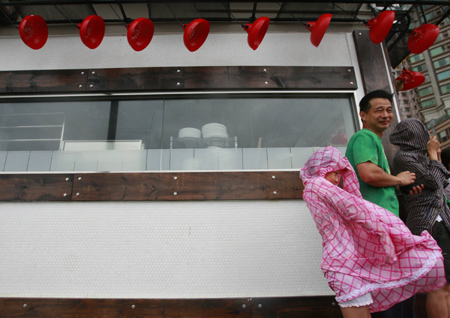 Updated: 2008-08-22 22:24 People brace themselves from the strong winds on a street in Hong Kong, South China, August 22, 2008. Hong Kong was buffeted by gale force winds on Friday as typhoon Nuri churned toward the major financial hub, with most of the city and its markets shut down ahead of a direct hit by its worst typhoon in five years. [Agencies] |