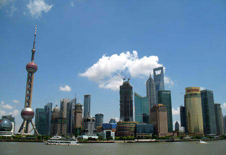 The skyline of Shanghai's lujiazui financial area is seen in this picture taken on August 26, 2008. Observation decks on 100th and 97th floors of the 101-storey tower, overlooking the city, are set to be finished and open to the public at the end of this month, providing visitors a spectacular view of downtown Shanghai and the winding Huangpu River. [CFP] |