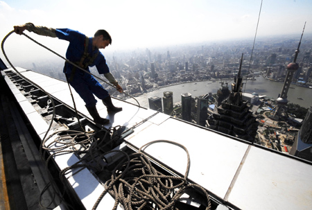 A construction worker works on the 492-meter-tall Shanghai World Financial Center under construction in Shanghai, August 26, 2008. Observation decks on 100th and 97th floors of the 101-storey tower, overlooking the city, are set to be finished and open to the public at the end of this month, providing visitors a spectacular view of downtown Shanghai and the winding Huangpu River. [CFP] |
