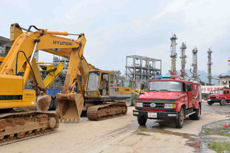 Fire engines are seen near the site of blast after Tuesday morning's explosion at a chemical plant in Yizhou, South China's Guangxi Zhuang Autonomous Region, August 27, 2008. [Xinhua]