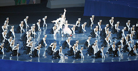 Li Yue (C), a 12-years-old victim of May 12 Wenchuan earthquake, stages a ballet at the opening ceremony of Beijing 2008 Paralympic Games in the National Stadium, September 6, 2008. [Xinhua]