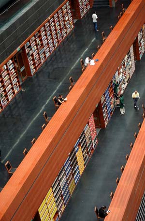 Updated: 2008-09-09 22:47 The reading area of the new building is seen in this picture taken on September 9, 2008. The Chinese national library's new building opened to the public on Tuesday, making it the world's third largest in terms of floor space. [Xinhua] |