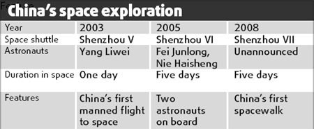 Updated: 2008-09-11 07:31 Bringing forward the launch date of China's third manned spacecraft by one month will maximize conditions for the country's highly anticipated inaugural spacewalk, experts have said. The Shenzhou VII spacecraft was first scheduled for take off from the Jiuquan Satellite Launch Center in Gansu province at the end of October. The spacecraft was later rescheduled for take off between Sept 25 and 30. Compared with the initial launching window in October, the position of the sun during the new period would enable astronauts to walk out of the space module in sunlight and avoid returning in "total darkness", the Beijing Evening News recently quoted an expert as saying.