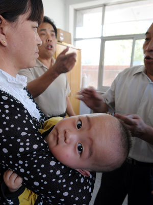 A woman holding her sick baby is seen at the Sanlu Group, Shijiazhuang, North China's Hebei Province, September 12, 2008. The baby suffered from kidney stone after drinking milk powder made by Sanlu. [Xinhua]
