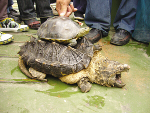 The tortoise is 80 centimeters long and weighs over 11 kilograms. It has six pairs of spikes on its shell and has been estimated to be over 500 years old. It was spotted by the owner of a local fish pond near the levee of the Yangtze River. The tortoise is very aggressive and will attack anybody who comes close. It was eventually caught from behind, a direction its powerful bite could not reach. The fish pond owner believes the tortoise crossed the levee when the Yangtze River was on the rise days ago. An expert said the fresh water tortoise is known as an Eaglemouth and is native to China. The species was long thought to be extinct due to over fishing. It is now a state protected animal.