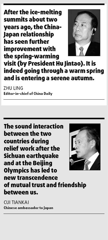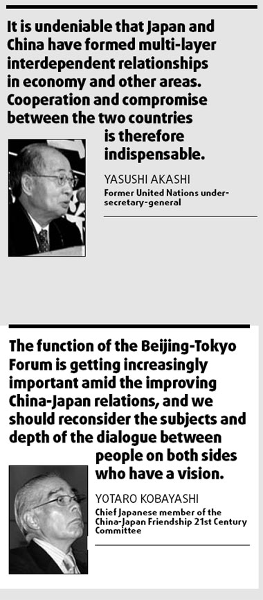 The Tokyo-Beijing Forum was co-founded by China Daily and Japanese NGO, Genron-NPO, as a platform for dialogue between the two countries' officials. "Our future will not necessarily be (one of) smooth sailing, and could see many tests. I believe Japan and China will adhere to the (May 2008) joint statement and overcome difficulties, and move forward with full courage," he said. Fukuda, who resigned as prime minister on Sept 1, supports friendly policies toward China. Bilateral relations, in fact, have warmed during his term. Though his resignation has created uncertainties, many senior Japanese politicians have assured China that Tokyo's policy toward Beijing would not change. One such assurance came from Japanese Foreign Minister Masahiko Koumura, who told the forum he hoped the two neighbors would continue their cooperation and work more closely on international issues. "Because of the current change in Japan's political situation many people are highly concerned over Japan's policy toward China," Koumura said, referring to the uncertainty created by Fukuda's resignation. "But I'm certain there will not be any change in promoting our relationship The path of Japan-China ties will not be swayed by either the international climate or domestic affairs," he said. Taro Aso, the frontrunner in the Japanese prime ministerial race, too, has gone on record saying he would maintain friendly ties with Beijing if elected. In a debate with other prime ministerial candidates on Friday, the outspoken Aso jokingly introduced himself as the candidate "who has caused concern that he will make an enemy out of China". But he said in all seriousness that such fears were unwarranted. "We will live together with China," he said. "Friendship is only a tool, the real goal is co-prosperity of Japan and China." The Chinese side expressed similar views. In a message to the forum, State Councillor Dai Bingguo said Sino-Japanese ties have reached a "new historic starting point", based on the "strategic relationship of mutual benefit". Communication platform key to bilateral relations ![]() ![]() ![]() |