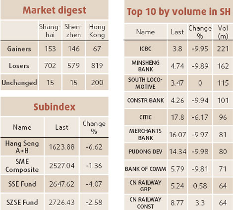 Updated: 2008-09-17 07:50 ![]() Hong Kong's shares tumbled 5.4 percent to a near two-year low yesterday after Lehman Brothers sought bankruptcy protection and fears about the US financial system knocked equity markets down across the world. Financial plays tumbled after Lehman failed to find a rescuer, insurer AIG struggled for survival and Merrill Lynch was snapped up by Bank of America, all of which unleashed a wave of global stock selling on Monday, when Hong Kong markets were closed for a holiday. Analysts said fears over the US financial system would carry on plaguing the market and drag it yet lower as long as investors remain unsure whether US markets have hit bottom. "There's a lot of issues investors need to deal with over the next few weeks - first of all, what's going to happen to AIG?" said Alex Tang, research director at Core Pacific-Yamaichi International. AIG, thrown a $20 billion lifeline by New York state, came under renewed pressure as ratings agencies downgraded its debt. "We are not expecting a major comeback. But major players and fund managers might start accumulating shares on any major dips because the valuations are good," Tang said. Tang added that investors are keenly waiting for more decisions from the US Federal Reserve, which held a one day interest rate meeting on yesterday. The benchmark Hang Seng Index ended down 1,052.29 points at 18,300.61, dragged down by steep losses in finance, energy, and telecom plays. It was the largest single-day percentage drop since January. Shares in Chinese insurer PICC Property and Casualty - 9.9 percent owned by AIG - plummeted 20.2 percent to a near-two year low. Heavyweight China Mobile fell nearly 6.1 percent. The Chinese Enterprises Index of mainland companies listed in Hong Kong ended down 7.4 percent at 9,236.58, less than half of last year's high of 20,609.10, and its lowest level in 18 months. Mainboard turnover climbed to roughly HK$88.4 billion, compared to Friday's HK$57.8 billion. Joseph Yam, chief executive of the Hong Kong Monetary Authority (HKMA), said Lehman Brothers' bankruptcy filing will have a negative impact on Hong Kong markets but the city's central bank will provide liquidity if needed. "Although the US stock market had a sharp fall on Monday, (there was) no panic selling," Yam said. Agencies ![]() (China Daily 09/17/2008 page15) |