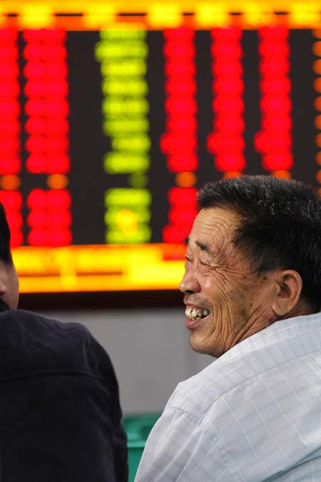Updated: 2008-09-19 16:34 ![]() A stock investor (R) smiles at a brokerage house in Zhengzhou, Central China's Henan Province, September 19, 2008. Chinese stocks soared 9.46 percent on Friday in response to an unprecedented package of government measures to support the market, and as a rebound of equities overseas eased fears for the global financial system.[CFP] |