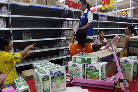 Updated: 2008-09-19 17:29 BEIJING -- Chinese supermarkets and shops pulled milk and a wide range of other dairy products off their shelves Friday as a sweeping recall of goods tainted with a dangerous chemical hit full gear. Yili, Mengniu and Guangming -- big brands consumed and trusted by hundreds of millions of Chinese -- were affected by the recall after authorities checked their products and found traces of melamine, a chemical used in plastics. "All problem products have been banned from our stores," said an executive at Jian-Mart, a popular supermarket chain.