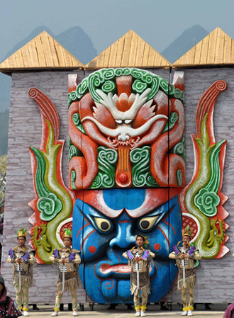 Actors in traditional costumes perform in front of a giant replica of a mask used in Di opera in Anshun of southwestern China's Guizhou Province on September 19, 2008. The Huangguoshu Waterfall Festival kicked off that day to boost tourism in the area. [Xinhua]