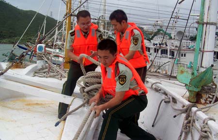 Updated: 2008-09-24 16:33 Frontier defense soldiers help fishermen reinforce boats in precaution against Hagupit, the 14th typhoon to affect China this year, in Zhangzhou City, East China's Fujian Province, Sept. 23, 2008. The Fujian Meteorological Station issued a yellow signal for typhoon early Tuesday, warning the central and southern coastal area of Fujian against the outer rim of Hagupit. [Xinhua] |