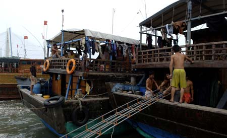 Vessels are anchored at a harbor in Haikou, capital of south China's Hainan Province, Sept. 23, 2008. Thousands of fishing boats in southern China have been recalled to ports as meteorologists on Tuesday warned Typhoon Hagupit is gathering strength as it neared coastal regions. [Xinhua] |