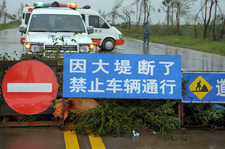 A road is cut off after sea waves washed away the dam in Yangjiang, South China's Guangdong Province, September 24, 2008. Six people were confirmed dead in the Typhoon Hagupit, the worst storm to hit Guangdong in more than a decade, which forced the closure of schools, halted flights and left many urban streets deserted after making landfall in Guangdong Province early on Wednesday. [Xinhua] |