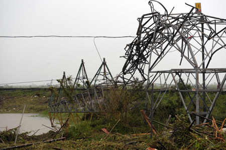 A power pylon is seen collapsed after the fierce rainstorm brought by Typhoon Hagupit in Yangjiang, South China's Guangdong Province, September 24, 2008. Six people were confirmed dead in the Typhoon Hagupit, the worst storm to hit Guangdong in more than a decade, which forced the closure of schools, halted flights and left many urban streets deserted after making landfall in Guangdong Province early on Wednesday. [Xinhua] |