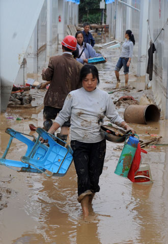 Local residents salvage their belongings before being evacuated to safe places, in Beichuan County, the epicenter of the May 12 devastating earthquake, in Sichuan Province, September 24, 2008. [Xinhua]
