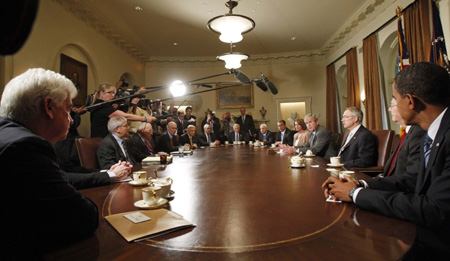US President George W. Bush meets with Bicameral and Bipartisan Members of Congress to discuss a Wall Street bailout plan in the Cabinet Room at the White House in Washington, September 25, 2008. Bush is joined by Republican presidential nominee Senator John McCain and Minority House leader John Boehnerand House Speaker Nancy Pelosi (D-CA). [Agencies]