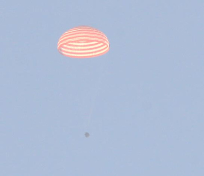 Updated: 2008-09-28 18:13 In this video grab from China Central Television, the re-entry capsule of the Shenzhou VII spaceship is seen before landing on the grassland of North China's Inner Mongolia Autonomous Region, September 28, 2008. [Xinhua]