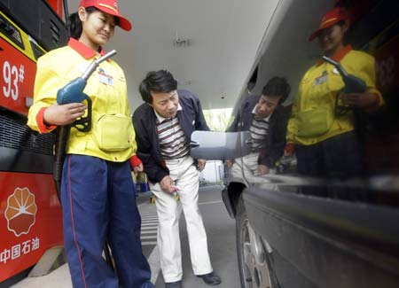 Updated: 2008-10-07 16:42 A motorist checks the petrol tank after a station attendant filled up his car at a PetroChina gas station in Beijing October 7, 2008. Beijing raised the price of refined oil products by up to 4 percent on Tuesday to cover the cost of cleaner fuel. [Agencies] |
