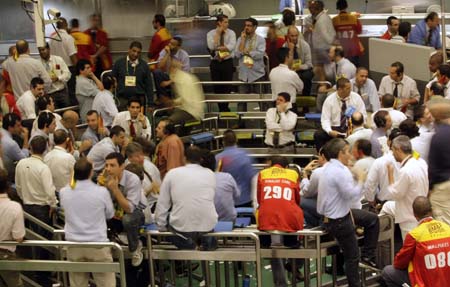 Traders take a break as trading was halted on the main floor of the BM&F Bovespa stock exchange market in Sao Paulo October 6, 2008. Trading on Brazil's stock market was halted after a 15 percent drop in its benchmark index, as Latin American currency, stock and bond markets disintegrated in opening trade on fears over the mushrooming global financial crisis. [Agencies]