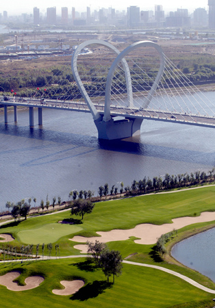 Sanhao Bridge over Hunhe River in Shenyang, Liaoning Province, is seen on its inauguration day, October 10, 2008. The 1,342 meter-long bridge is deemed the most beautiful bridge in the city, with two arches designed like wings of a butterfly. [CFP] |