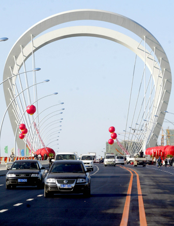 Vehicles travel through the Sanhao Bridge over Hunhe River in Shenyang, Liaoning Province, on its inauguration day, October 10, 2008. The 1,342 meter-long bridge is deemed the most beautiful bridge in the city, with two arches designed like wings of a butterfly. [CFP] |