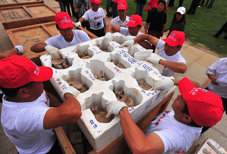 Updated: 2008-10-10 17:13 ![]() Workers pack the dinosaur fossil to be donated to Hong Kong Special Administrative Region, in Lufeng World Dinosaur Valley, southwest China's Yunnan Province, Oct. 9, 2008. [Xinhua]