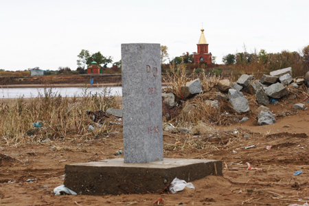 An undated file photo of a border monument between Russian and China's Heilongjiang Province near Heixiazi Island. China will restore sovereign control over half of Heixiazi Island from Russia from October 14, 2008 after the two countries jointly unveil a stone monument on the Island. Heixiazi Island was occupied by the former Soviet Union during a 1929 border skirmish. [CFP] |