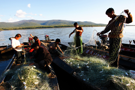 Chinese fishermen work near the Heixiazi Island on the border between Russia and China's Heilongjiang Province. China will restore sovereign control over half of Heixiazi Island from Russia from October 14, 2008 after the two countries jointly unveil a stone monument on the Island, completing the final border demarcation with Russia. Heixiazi Island was occupied by the former Soviet Union during a 1929 border skirmish. [CFP] |