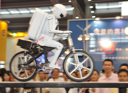 People watch a robot riding a bicycle at the 10th China International Hi-tech Trade Fair in Shenzhen, Guangdong Province, October 13, 2008. Performances by robots attracted many visitors at the hi-tech trade fair. [Xinhua] |