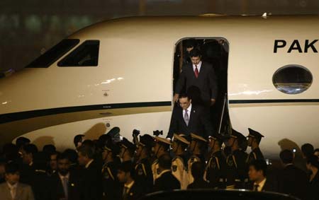 Updated: 2008-10-15 13:21 BEIJING -- Pakistani President Asif Ali Zardari is set to usher in a series of agreements with China on Wednesday, highlighting Islamabad's hopes that Beijing will help it through economic and diplomatic troubles. Zardari arrived on Tuesday for his first visit to China as president, and has said he wants his four-day trip "to remind the leadership of the world how close our relationship is". He is wooing Beijing at a time when his country's relations with the United States are strained after US forces in Afghanistan carried out cross-border air raids and at least one ground assault on al Qaeda and Taliban targets in Pakistan. ![]() Pakistan's President Asif Ali Zardari (2nd from top) arrives at Beijing Capital International Airport October 14, 2008. [Agencies]